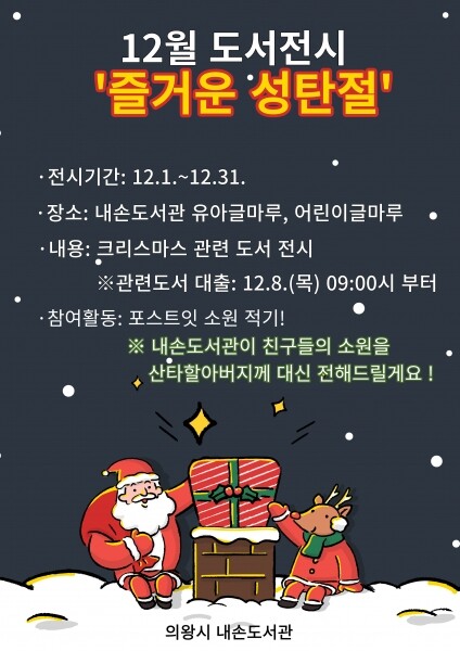이경미 도서관운영과장은 “크리스마스 도서전시회를 통해 아이들에게 행복한 추억을 선사할 수 있기를 바라며 아울러 12월 1일부터 도서관에 대한 만족도 조사를 시행해 더 나은 서비스를 제공하고자 하오니 시민 여러분의 많은 참여와 관심을 부탁드린다”고 전했다.