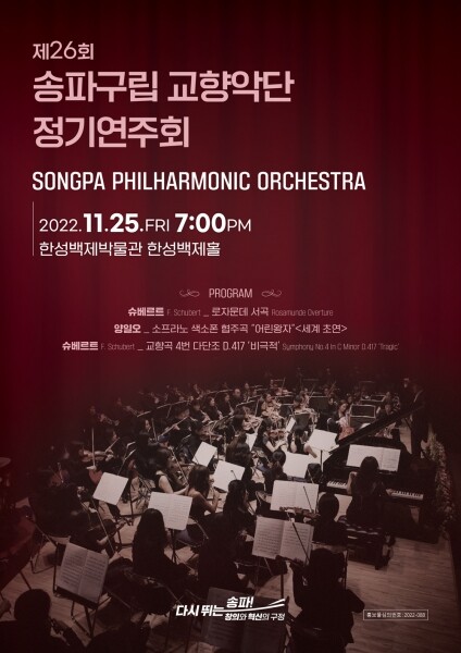 서강석 송파구청장은 “오랜만에 개최되는 정기연주회를 통해 많은 구민들이 아름다운 선율을 가까이서 즐기고 따뜻한 힐링의 시간이 되기를 바란다”며 “앞으로도 문화·예술에 대한 깊이 있는 지원과 체계적인 육성, 진흥으로 문화·예술이 살아 숨 쉬는 송파를 만들어가겠다”고 전했다.