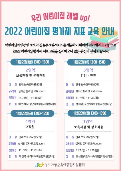 한편 가평군육아종합지원센터에서는 어린이집 평가제 지표 교육을 다가오는 12월에도 같은 내용으로 실시할 예정이다.
