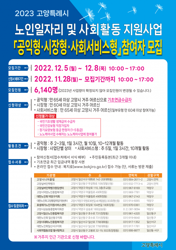 고양특례시, 2023년 노인일자리 및 사회활동 지원사업 참여자 모집