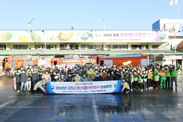 이날 훈련에는 구리시, 구리농수산물도매시장, 구리소방서 구리경찰서 육군 제73사단 203여단, 한국전력공사 등 유관기관 및 시민 단체, 지역주민 등 200여명과 소방차, 구급차, 굴절 사다리차 등 40여대의 장비가 투입됐다.