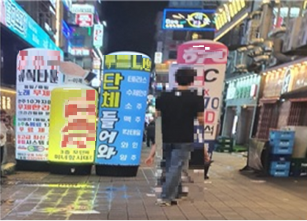 불법 입간판은 도시 미관을 저해하고 안전에 방해가 되고 있으며 전기를 사용하는 에어라이트는 대부분이 불법이다.