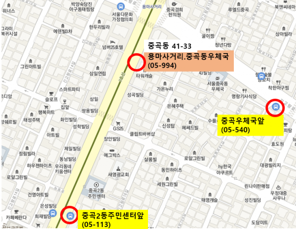 중곡2동주민센터와 중곡동우체국 앞에 마을버스 정류소를 운영하고 있으나 두 정류소 간 간격이 멀어 이용에 불편함이 있었다.