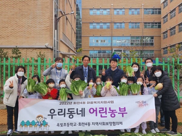 ‘우리동네 어린농부’는 회천4동 지역사회보장협의체가 추진하는 2022년 마을복지지원사업의 일환으로 옥빛초 학생들이 직접 텃밭을 가꾸고 키운 수확물을 주위 어려운 이웃에게 나누는 사업이다.