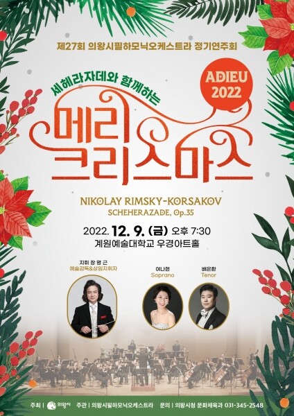이날 공연에서 의왕시필하모닉오케스트라는 천일야화를 배경으로 하고 있는 림스키-코르사코프의 교향 모음곡 ‘세헤라자데’, ‘크리스마스 페스티벌’를 연주하고 소프라노 여나현, 테너 배은환 등 유명 성악가가 함께 출연해 ‘메모리’,‘남몰래 흐르는 눈물’,‘오 신성한 밤’등을 노래한다.
