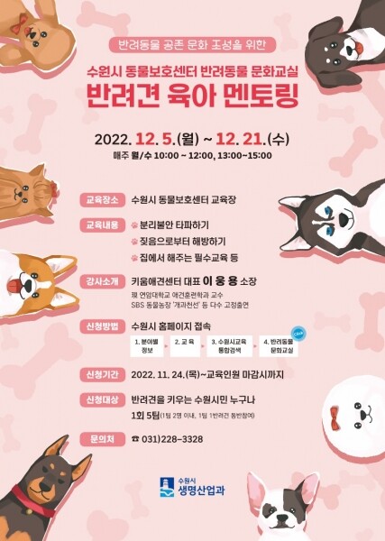 12월 5일부터 21일까지 매주 월·수요일 오전 10~12시, 오후 1~3시에 수원시 동물보호센터에서 교육이 진행된다.