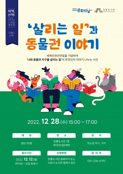 12월 28일 오후 3시에는 ‘살리는 일’의 박소영 작가가 성인을 대상으로 ‘살리는 일과 동물권 이야기’를 주제로 강연한다.