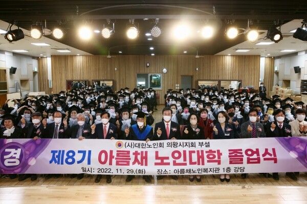 [뉴스서울] 대한노인회 의왕시지회는 지난 29일 아름채노인복지관 1층 대강당에서 136명의 졸업생과 내빈들이 참석한 가운데 아름채노인대학 제8기 졸업식을 가졌다.