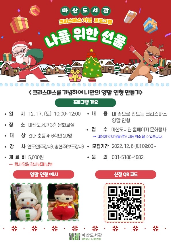 김포시 마산도서관은 12월 17일 오전 10시 관내 초등학교 4~6학년생 어린이 20명을 대상으로 크리스마스 기념 프로그램 ‘나를 위한 선물’을 운영한다.