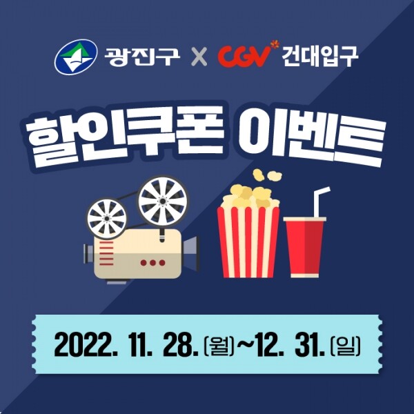 카카오톡에서 ‘광진구청’을 친구 추가하면 CGV 건대입구점에서 사용할 수 있는 매표·매점 할인쿠폰 2종이 지급된다.