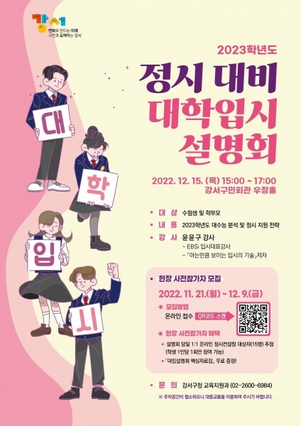 구는 오는 15일 강서구민회관 우장홀에서 ‘2023학년도 정시 대비 대학입시 설명회’를 개최한다고 밝혔다.