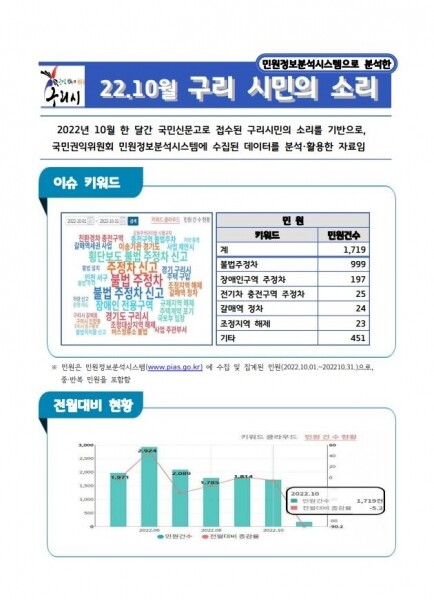 ‘구리 시민의 소리’는 직전 한 달간 국민신문고로 접수된 구리시 민원 정보 데이터를 분석·활용해, 전반적인 민원 동향부터 구체적인 민원 사례까지 파악할 수 있도록 만든 자료로 전 부서에서 공유하고 민원제도 개선 발굴을 위한 기초자료로 활용된다.