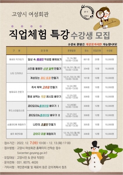 수강생은 12월 7일부터 13일까지 여성회관 홈페이지에서 선착순으로 접수한다.