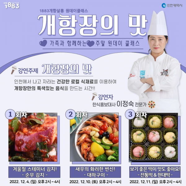 이번 행사는 ‘개항장의 맛’이라는 주제로 인천에서 나고 자라는 건강한 로컬 식재료를 이용해 개항장만의 특색있는 음식을 만드는 시간으로 구성된다.