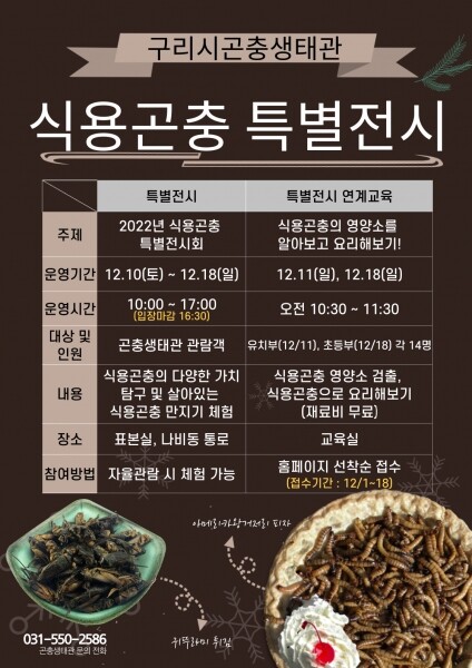 체험 수업은 12월 11일과 18일 2번이며 구리시 곤충생태관 홈페이지에서 12월 1일부터 18일까지 선착순으로 사전 예약을 받고 있다.
