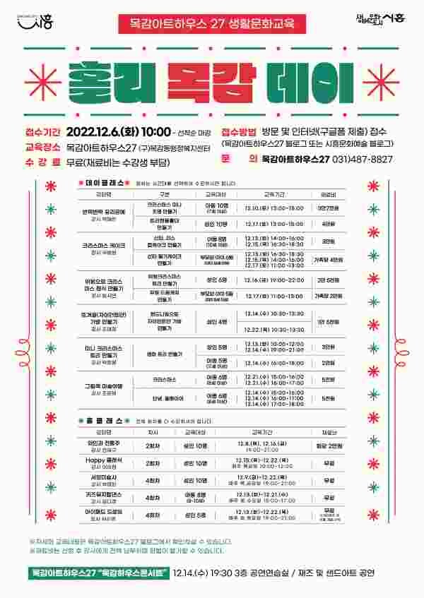 시 관계자는 “올해 개관한 목감아트하우스27이 지역주민들이 언제든지 와서 즐길 수 있는 공간으로 자리매김할 수 있도록 다양한 공연과 생활문화교육 프로그램을 지속적으로 운영할 예정”이라고 밝혔다.