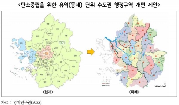 이에 연구원은 탄소정책과 인구정책 간 모순을 극복하기 위한 지속가능한 탄소중립 구조 구상 전략으로 ‘자립 동네’로 전통 자연기반해법인 ‘풍수+문전옥답+차경’을 합쳐진 ‘K-탄소중립’ 국토계획과 환경계획의 통합관리, 자연환경 총량 관리, 지속가능한 공간 관리가 용이한 유역 단위 행정구역 개편 등을 제안했다.