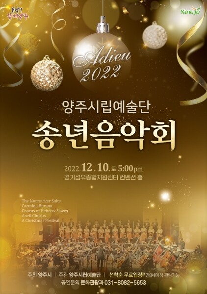 이번 음악회는 다사다난했던 2022년을 보내고 새로운 해를 맞아 양주시의 새로운 도약에 대한 기대를 담아 ‘아듀 2022년’라는 주제로 개최된다.