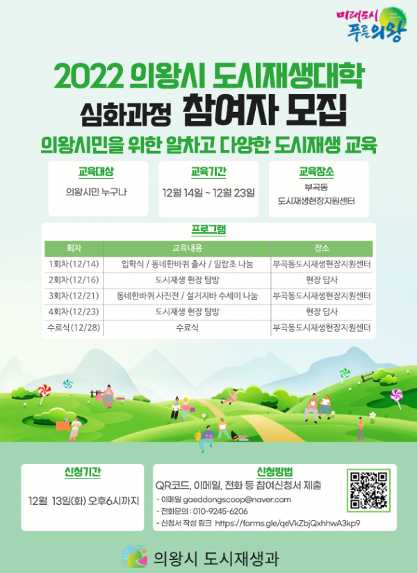 이번 과정은 현장답사를 포함해 총 4회차 수업을 진행할 예정이며 수강 신청은 12월 13일까지 전화, 이메일 등으로 가능하다백양현 의왕시통합도시재생지원센터장은 “도시재생대학은 도시재생에 대한 올바른 이해를 통해 도시재생 기획, 계획, 실행 능력을 함양하는 것이 목표”며 “도시재생사업의 성패는 주민이 계획단계부터 사업 전반에 걸쳐 얼마나 적극적이고 능동적으로 동참하느냐에 달린 만큼 도시재생대학을 통해 역량을 강화하는 성숙한 시민의 모습을 보여달라”고 당부했다.