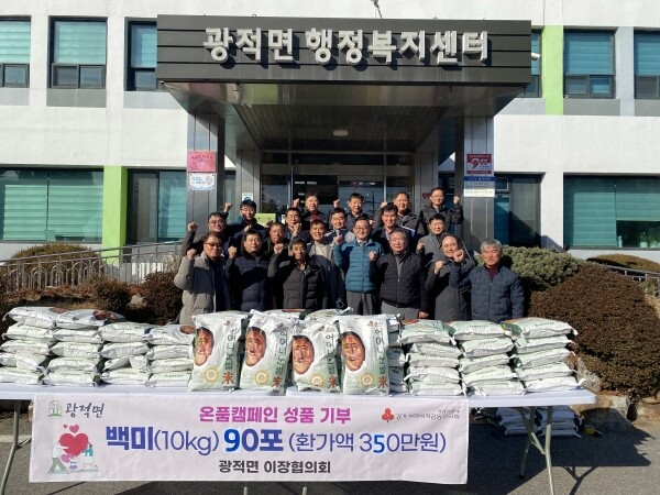 권순용 광적면장은 “매년 힘들게 농사지은 쌀을 특별한 관심과 사랑으로 기부해 주신 모든 이장님께 감사드린다”며 “어려운 경제 여건 속에 복지사각지대가 발생하지 않도록 행정에서도 최선을 다하겠다”고 말했다.