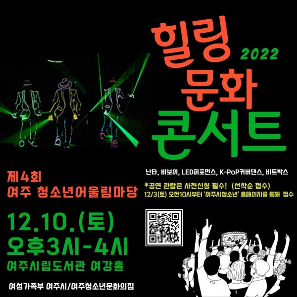 비보이 댄스, 난타, LED 퍼포먼스, 케이팝 커버댄스, 비트박스 등 다양한 공연이 진행될 이번 콘서트는, 여주지역 청소년 및 청소년을 포함한 가족 총 197명을 대상으로 무료로 진행한다.