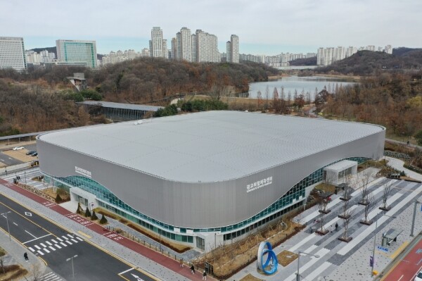 광교호수공원 양 쪽 원천호수와 신대호수 사이에 자리잡은 광교복합체육센터는 연면적 1만2652.55㎡ 규모로 아이스링크와 수영장을 갖추고 있다.