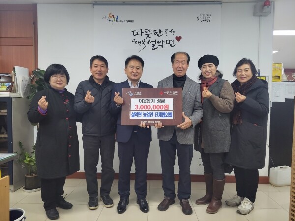 설악면 농업인단체협의회는 농업인단체협의회 최인혁 회장과 회원 95만원 농촌지도자회 손용석 회장과 회원 50만원 농업경영인회 이기철 회장과 회원 20만원 한우축산계 이성우 회장과 회원 20만원 생활개선회 이정분 회장과 회원 20만원 여성농업인회 곽동희 회장과 회원 10만원 쌀연구회 백승남 회장과 회원 10만원 사과작목반 이성세 회장과 회원 10만원 유명산 포도작목반 손용석 회장과 회원 10만원 시설채소작목반 박상견 회장과 회원 10만원 오디뽕작목반 이강언 회장과 회원 15만원 찰옥수수작목반 강근원 회장과 회원 10만원 양계회 권영돈 회장과 회원 10만원 한봉작목반 권오선 회장과 회원 10만원 등 회원들이 십시일반 모은 성금으로 기탁했다최인혁 회장은 “농업인 13개 단체 회원들이 한 마음으로 나눔에 동참해 따뜻한 사회를 만들어 가는 데 힘을 보태고자 한다 앞으로도 우리 농업인들은 지역사회와 상생·화합하고 다양한 나눔활동을 꾸준히 펼쳐나가겠다”고 말했다.