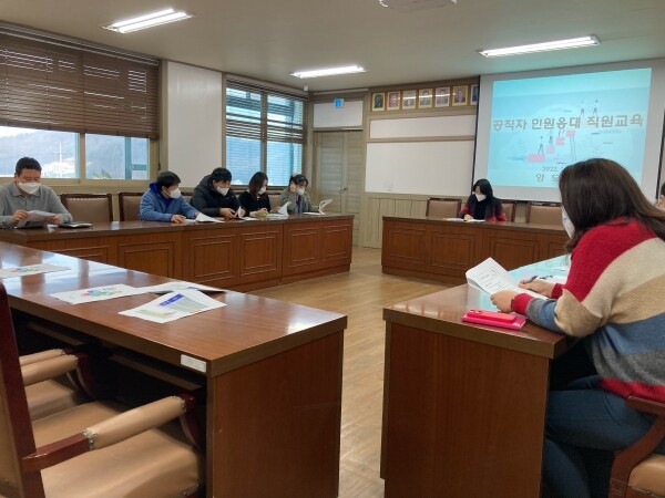 우선 대민업무가 주를 이루는 면사무소 업무 특성을 감안해 조순이 면장 주관 하에 민원응대요령 교육을 진행했다.