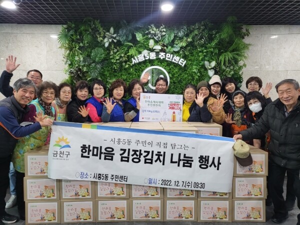 이날 김치 나눔 봉사활동에는 시흥5동 주민을 비롯해 주민센터 직원 등 30여명이 참여했으며 직접 담근 김치 50박스를 지역 저소득층 50가구에 전달했다.