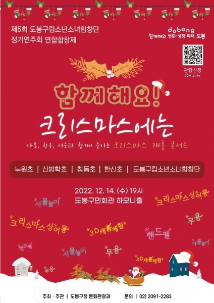 온가족이 함께할 수 있는 크리스마트 연주회 ‘함께해요 크리스마스에는’은 도봉구립소년소녀합창단의 공연 외에도 도봉구립교향악단과 협연, 누원초등학교의 핸드벨 합창단, 한신초등학교의 현대무용 공연, 신방학초등학교의 풍물 공연, 창동초등학교의 리코더 공연 등이 준비됐다.