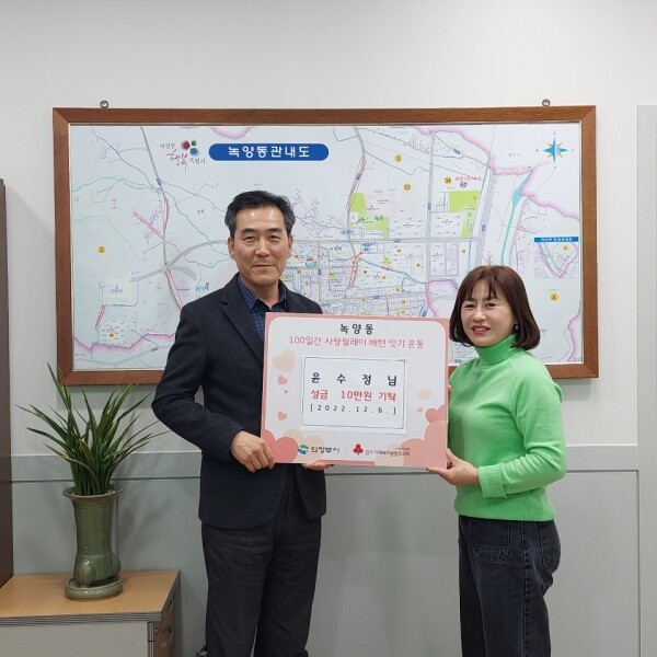 [뉴스서울] 의정부시 녹양동주민센터는 12월 6일 정수진 녹양초등학교 학부모회장이 동주민센터를 방문해 성금 10만원을 기탁하며 100일간 사랑 릴레이 배턴을 이어 나갔다고 밝혔다.