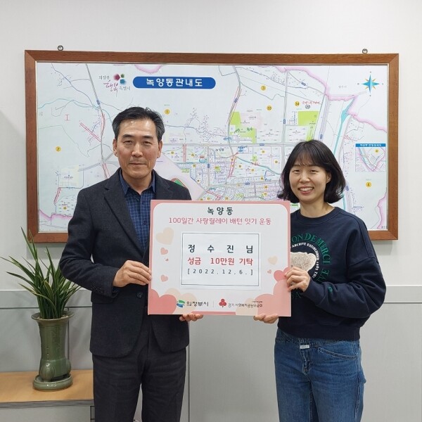[뉴스서울] 의정부시 녹양동주민센터는 12월 6일 윤수정 녹양중학교 학부모회장이 동주민센터를 방문해 성금 10만원을 기탁하며 100일간 사랑 릴레이 배턴을 이어 나갔다고 밝혔다.