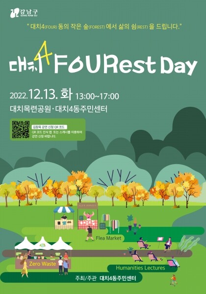 대치4동에서 올해 처음 개최하는 이번 축제는 환경을 주제로 중고 나눔장터 업사이클링 체험 환경 전시 인문 강연 나눔 기부 작은 음악회 등 다채로운 행사로 진행된다.