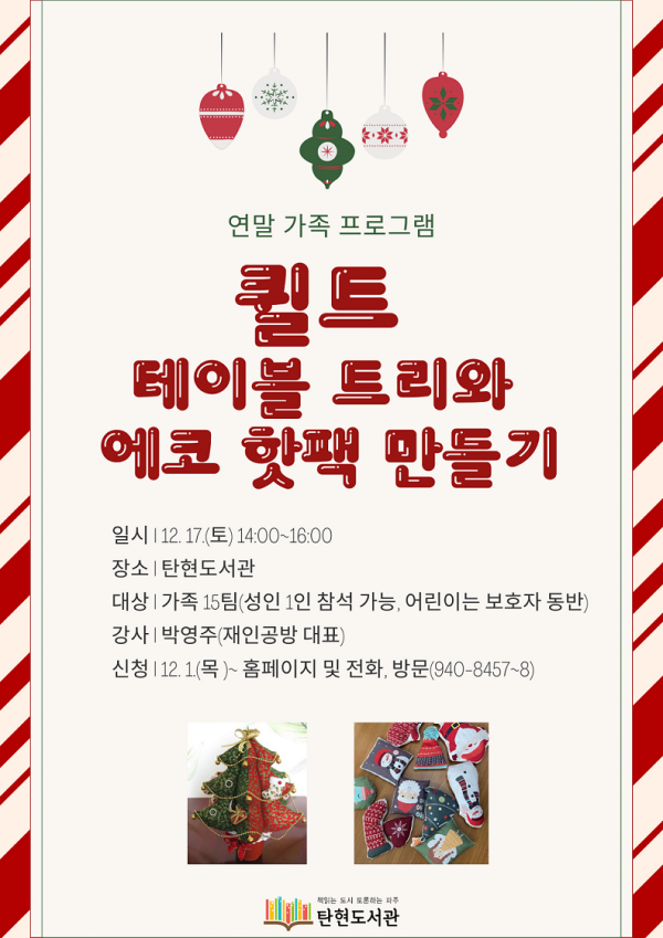 강의는 지역에서 퀼트 공방을 운영하고 작은도서관 활동가이기도 한 박영주 강사가 진행하며 탄현도서관 사서가 크리스마스 그림책을 읽어주는 시간도 마련됐다.