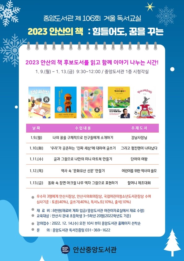 이번 겨울 독서교실에서는 ‘2023 안산의 책 : 힘들어도, 꿈을 꾸는’을 주제로 2023년 안산의 책 어린이부문 후보도서 5권을 활용한 독후활동으로 토론 수업 글쓰기 수업 북아트 만들기 역사신문 만들기 아크릴 액자 그림 그리기 등의 시간을 갖는다.