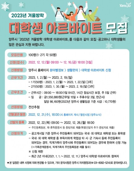 신청자격은 2022년 12월 12일 기준 양주시에 주민등록을 둔 국내·외 대학교 재학생이나 휴학생으로 평생교육법에 의한 사이버대학교, 학점은행 교육기관 등 학생과 최근 2년 이내 대학생 아르바이트에 선발된 학생은 제외된다.