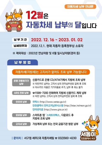 서구 관계자는 “자동차세를 기한 내 납부하지 않으면 세액의 3%에 해당하는 가산금과 중가산금을 추가로 부담하게 된다”며 “자동차 번호판 영치, 압류, 공매 등의 불이익을 받을 수 있으니 기한 내 납부해 줄 것을 당부드린다”고 말했다.