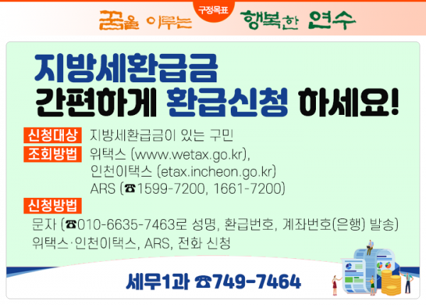 이에 연수구는 기존의 전화, 방문, 인터넷, FAX 등을 통해서만 가능했던 지방세 환급 신청을 언제 어디서나 24시간 신청 가능한 문자 신청서비스를 시행 중이다.