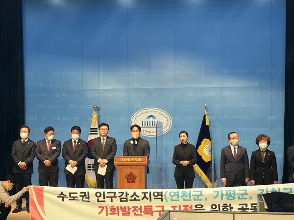 김성원 의원과 최춘식 의원, 배준영 의원 , 김덕현 연천군수, 서태원 가평군수, 김진성 부군수는 12일 국회 소통관에서 기자회견을 열고 “옹진, 연천, 가평, 강화군이 특별법의 핵심인 기회발전특구 지정 대상에서 명목상 수도권이라는 이유로 제외될 위기에 놓여 있다”며 “윤석열 대통령의 주요 국정과제인 지방시대 구현을 위해서라도수도권 인구감소지역은 기회발전특구 지정 대상에 포함될 수 있도록 법안을 수정해야 한다”고 강조했다.