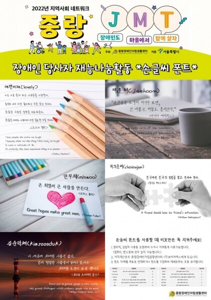 참여자들의 재능나눔활동 일환으로 제작된 이번 폰트는 모두 무료로 중랑구청 홈페이지나 중랑장애인자립생활센터 홈페이지에서 내려 받을 수 있다.