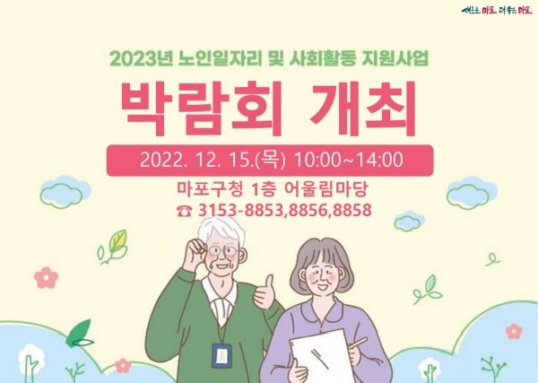 2023년도 노인일자리 사업의 신규 참여자 모집을 위해 12월 15일 오전 10시부터 오후 2시까지 마포구청 1층 어울림마당에서 어르신들을 위한 일자리 박람회를 진행할 예정이다.