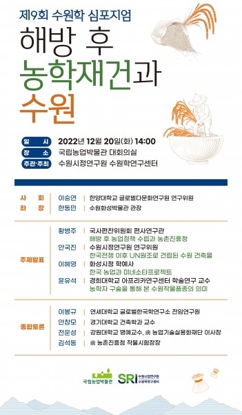 이번 수원학 심포지엄 개최를 통해 2022년 국립농업박물관 개관 및 농촌진흥청 설립 60주년을 기념하고 한국전쟁 복구과정에서 UN원조로 건립된 농촌진흥청 등 수원의 주요건축물에 대한 건축기술 및 역사적 가치평가, 한국 농학연구와 선진농법 개발을 통한 해방 후 농학 재건역사 및 영농과학의 중심지인 수원의 농업 전통 계승을 재조명할 예정이다.