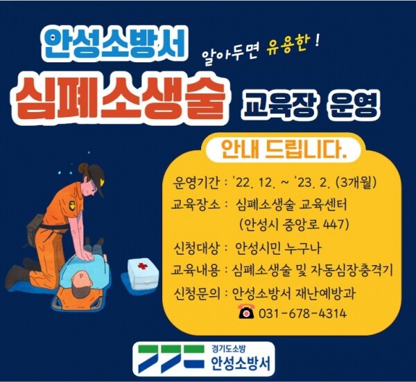 교육 장소는 심폐소생술 교육센터에서 진행되며 교육일정 및 신청방법은 안성소방서 교육담당 전화로 문의하면 된다.