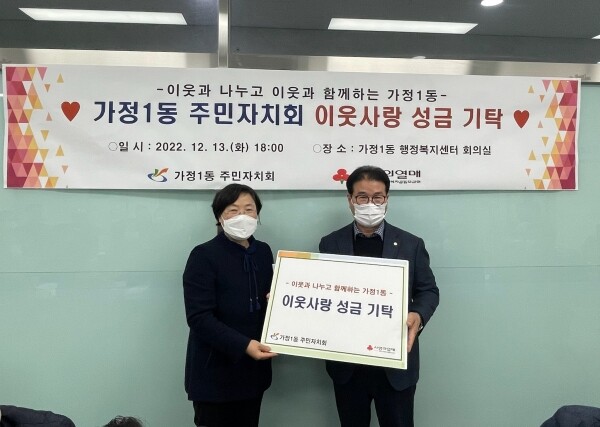 가정1동 주민자치회는 주변의 어려운 이웃들이 겨울을 건강하고 따뜻하게 보내길 바라는 마음을 담아 ‘이웃과 나누고 이웃과 함께하는 가정1동’이라는 슬로건 아래 이웃사랑 성금을 모았다고 밝혔다.