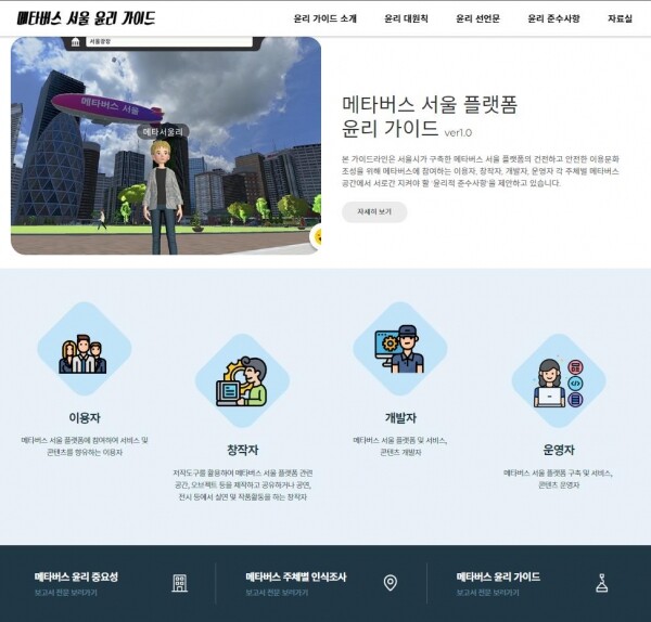 이번 윤리 가이드는 메타버스 서울 플랫폼의 공공적 특성에 맞게 차별화한 것이 특징이며 이용자, 창작자, 개발자, 운영자가 지켜야 할 윤리적 준수사항을 제공한다.