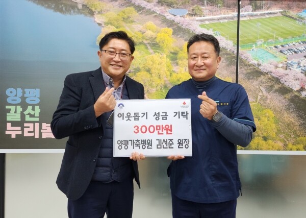 조근수 양평읍장은 “지난해에 이어 뜻깊은 이웃사랑 나눔을 몸소 실천해 주신 양평가축병원 김선준 원장에게 깊이 감사드린다”며 “동절기 한파에 우리 읍 이웃들에게 난방비를 지원함으로써 추운 겨울을 버틸 따뜻한 온기를 전하겠다”고 전했다.