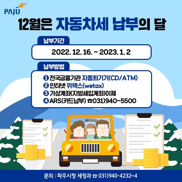 과세대상은 12월 1일 현재 파주시에 등록된 자동차와 125cc를 초과하는 이륜차 및 덤프트럭과 콘크리트 믹서트럭으로 과세대상은 7만1,673건이다.