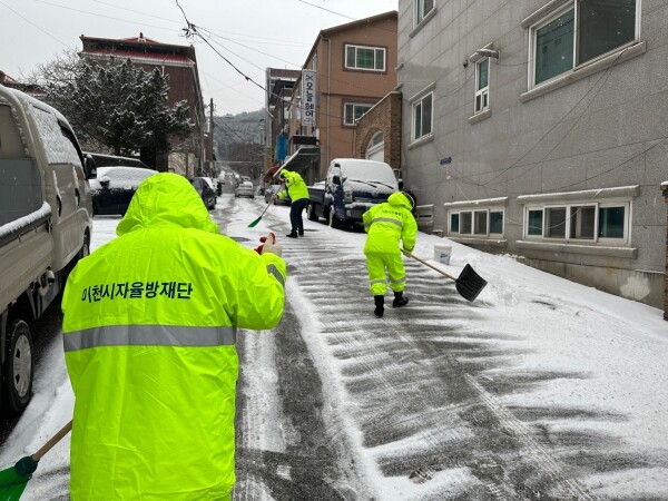 제설작업에는 이천시 자율방재단원 30여명이 적극 참여했으며 주택가 및 전통시장 진출입로 이면도로 및 교차로 약 5km의 구간의 눈을 치우고 밤사이 영하권의 기온으로 도로가 결빙되지 않도록 제설제를 살포했다.