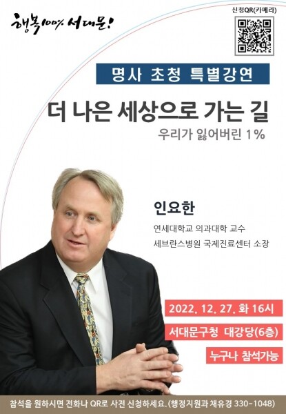 그 네 번째 시간으로 이달 27일 오후 4시부터 5시 30분까지 구청 6층 대강당에서 인요한 교수가 ‘더 나은 세상으로 가는 길, 우리가 잃어버린 1%’란 주제로 강연한다.