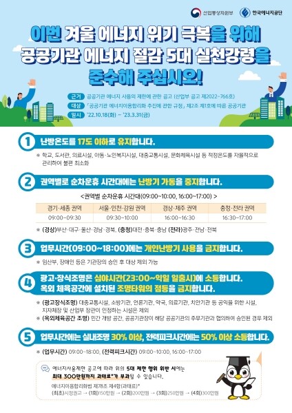5대 실천 강령에는 난방온도를 17도 이하로 유지 순차운휴 시간대 난방기 가동 중지 업무시간에 개인난방기 사용 금지 심야시간에 경관 조명 소등 및 조명타워 소등 업무시간에 실대조명 30%이상, 전력피크시간에는 50%이상 소등이 있다.